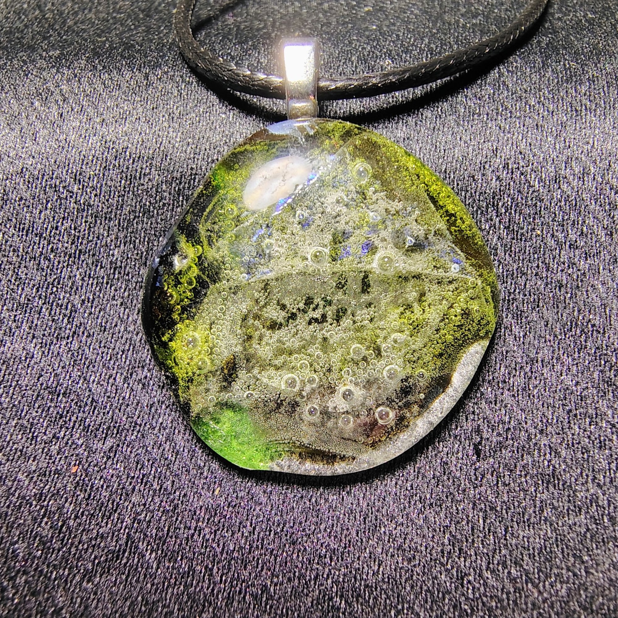 fused dichroic glass, silver plated bail, 20" woven lobster clasp cord