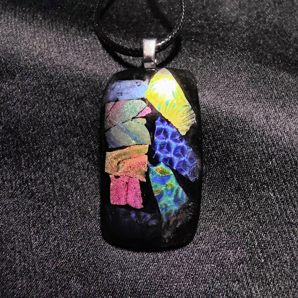 fused dichroic glass, silver plated bail, 20" woven lobster clasp cord
