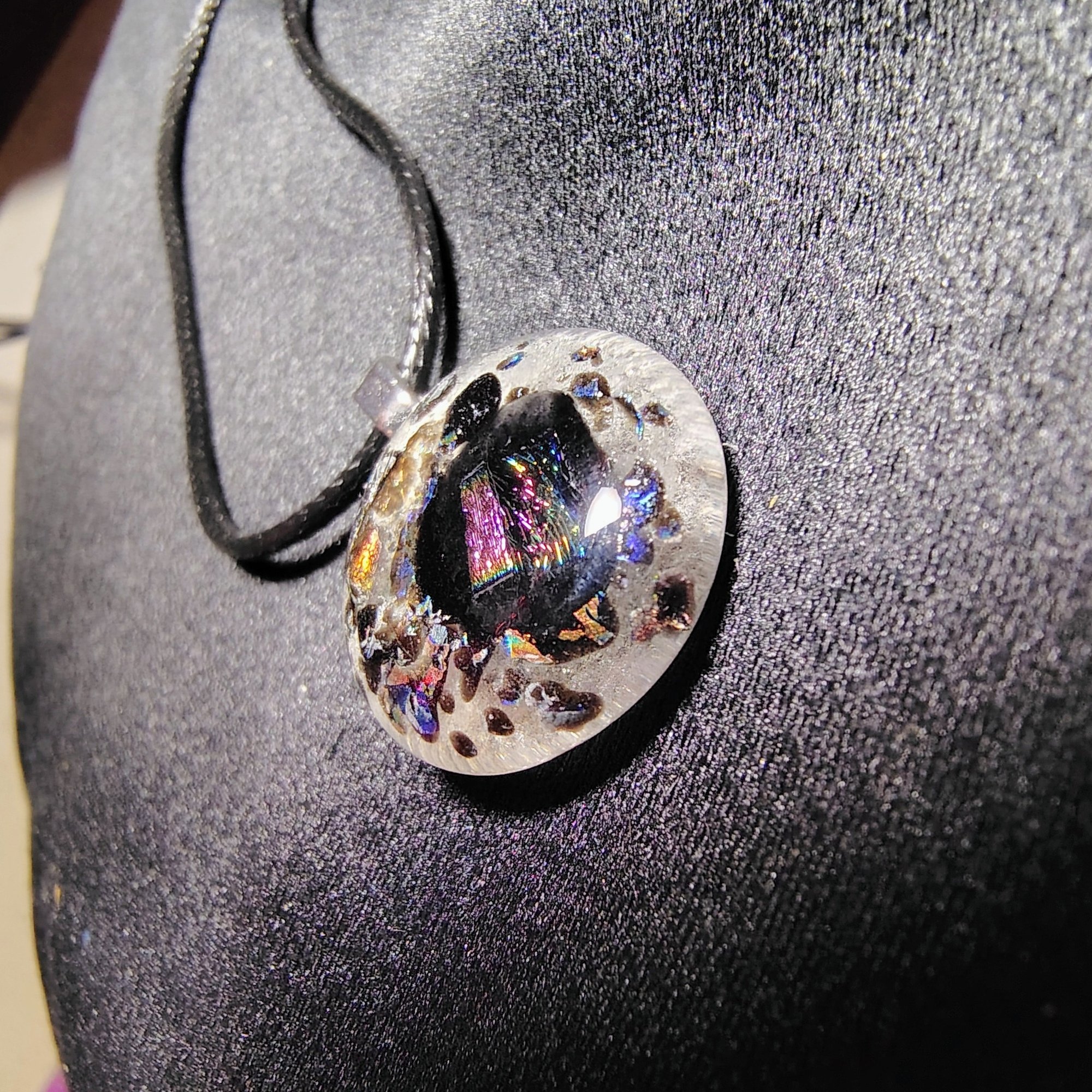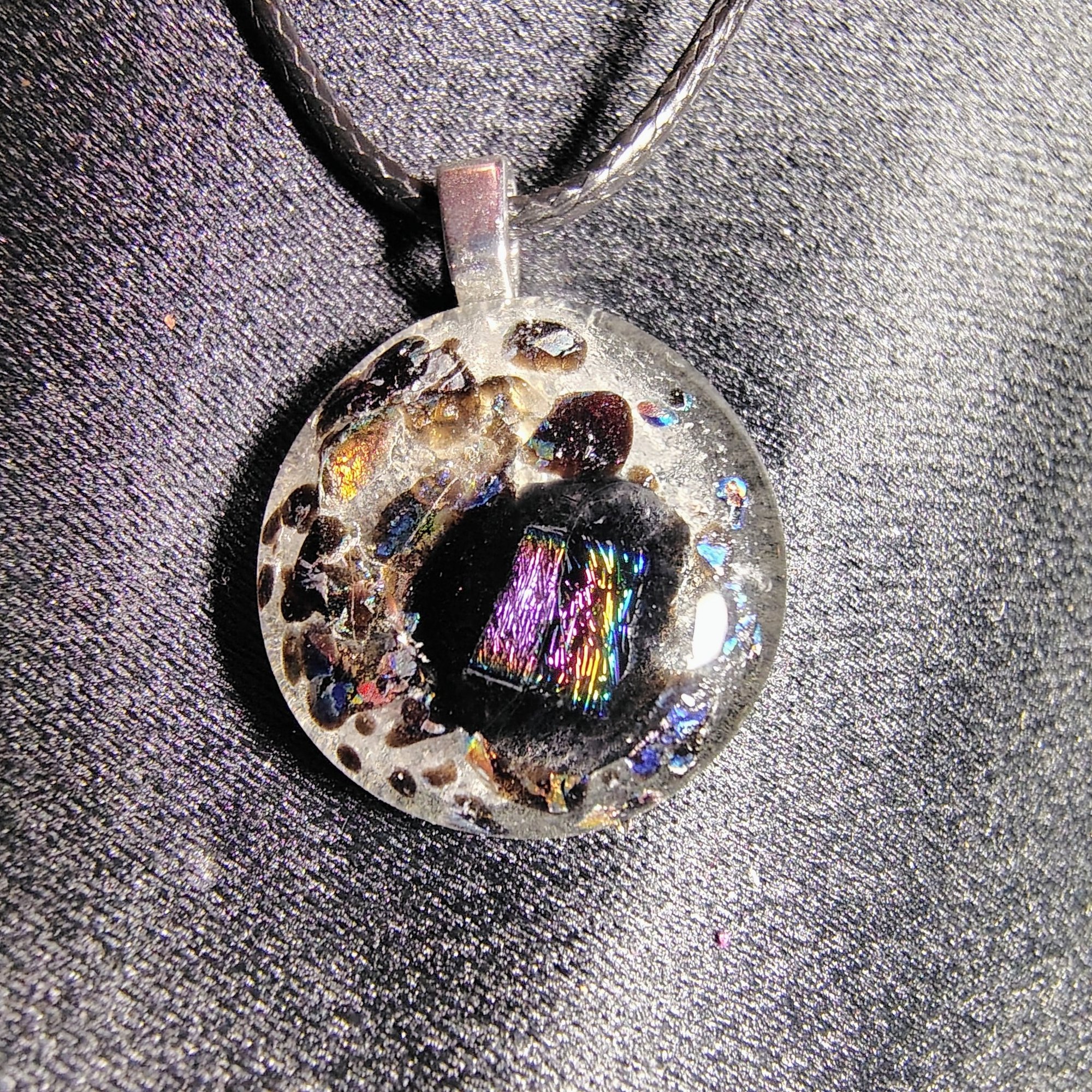 fused dichroic glass, silver plated bail, 20" woven lobster clasp cord