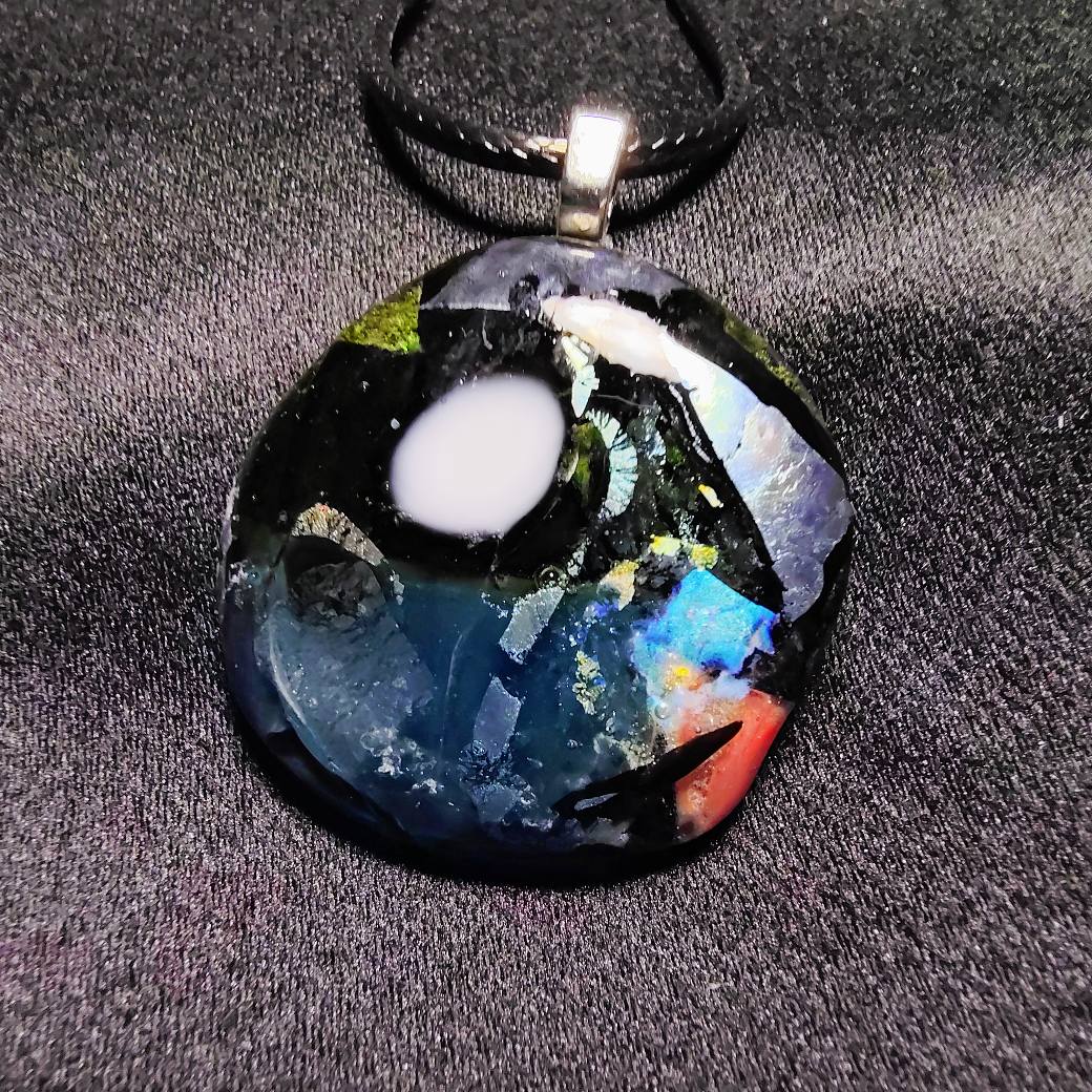 fused dichroic glass, silver plated bail, 20" woven lobster clasp cord