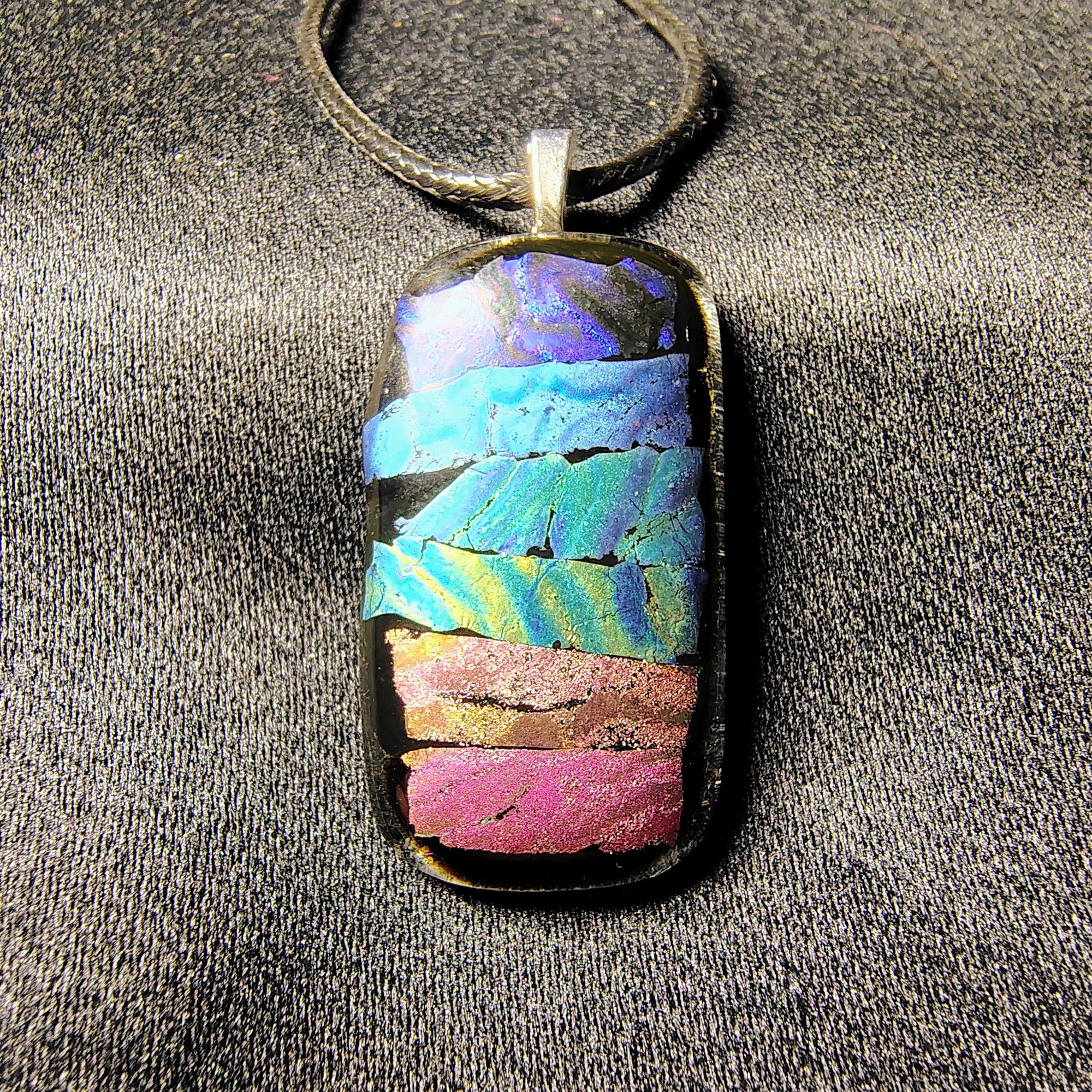 Inspired by the Painter's pallet, 'Rainbow Array' features six different shades of dichroic glass fused with a matte finish into a deep black base.