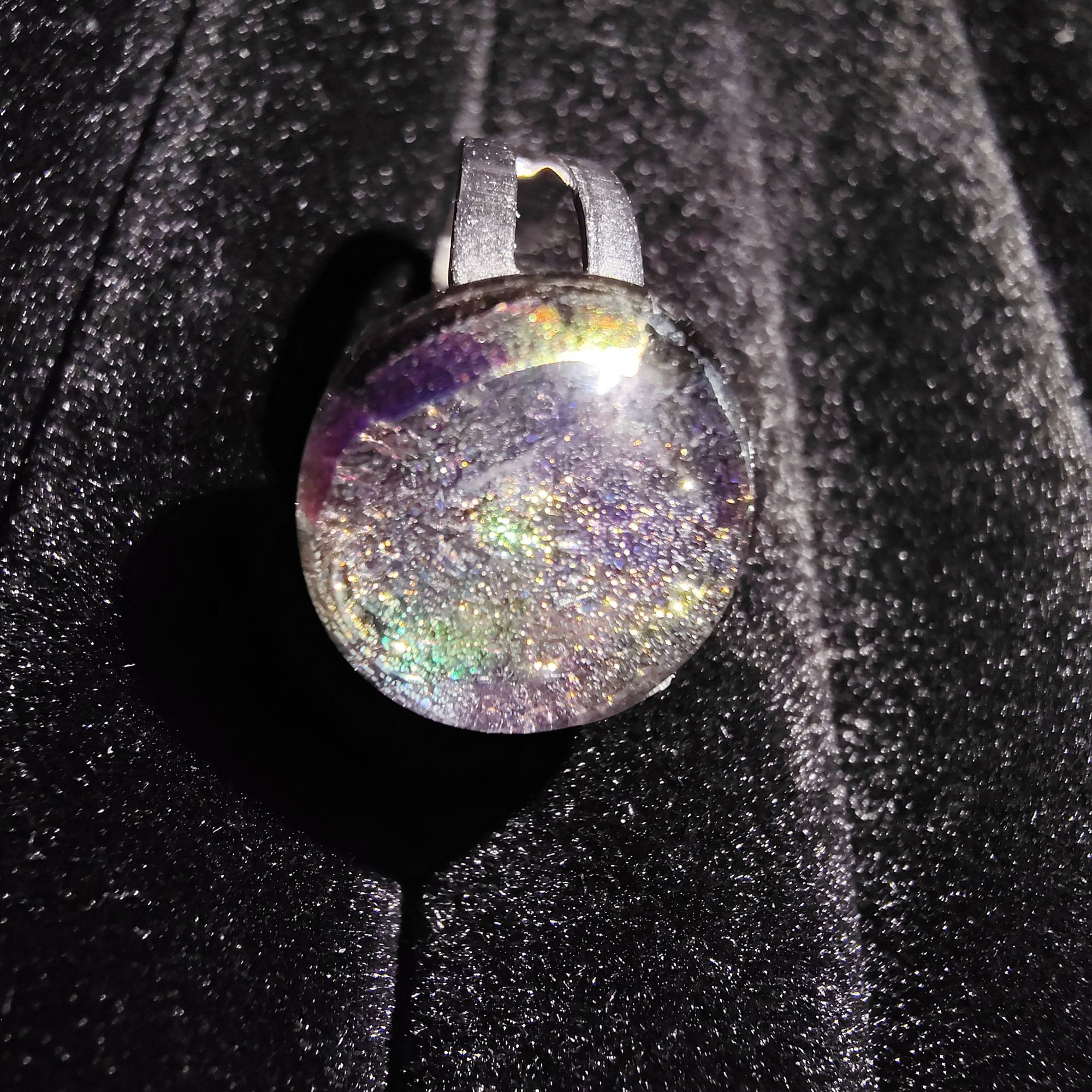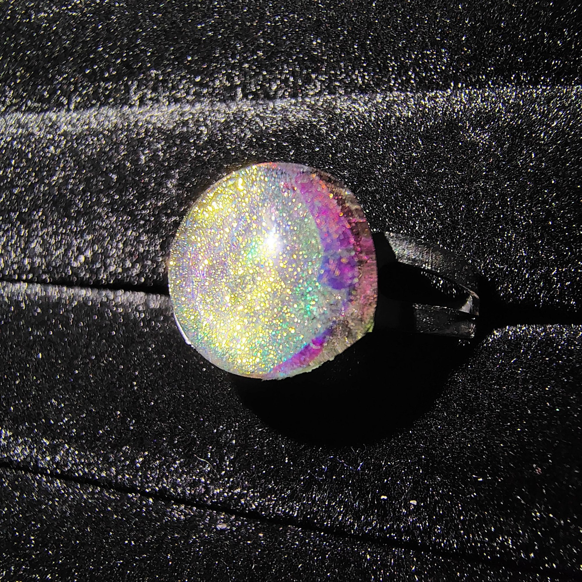 1/5" kiln fused dichroic glass cabochon, stainless steel adjustable ring band