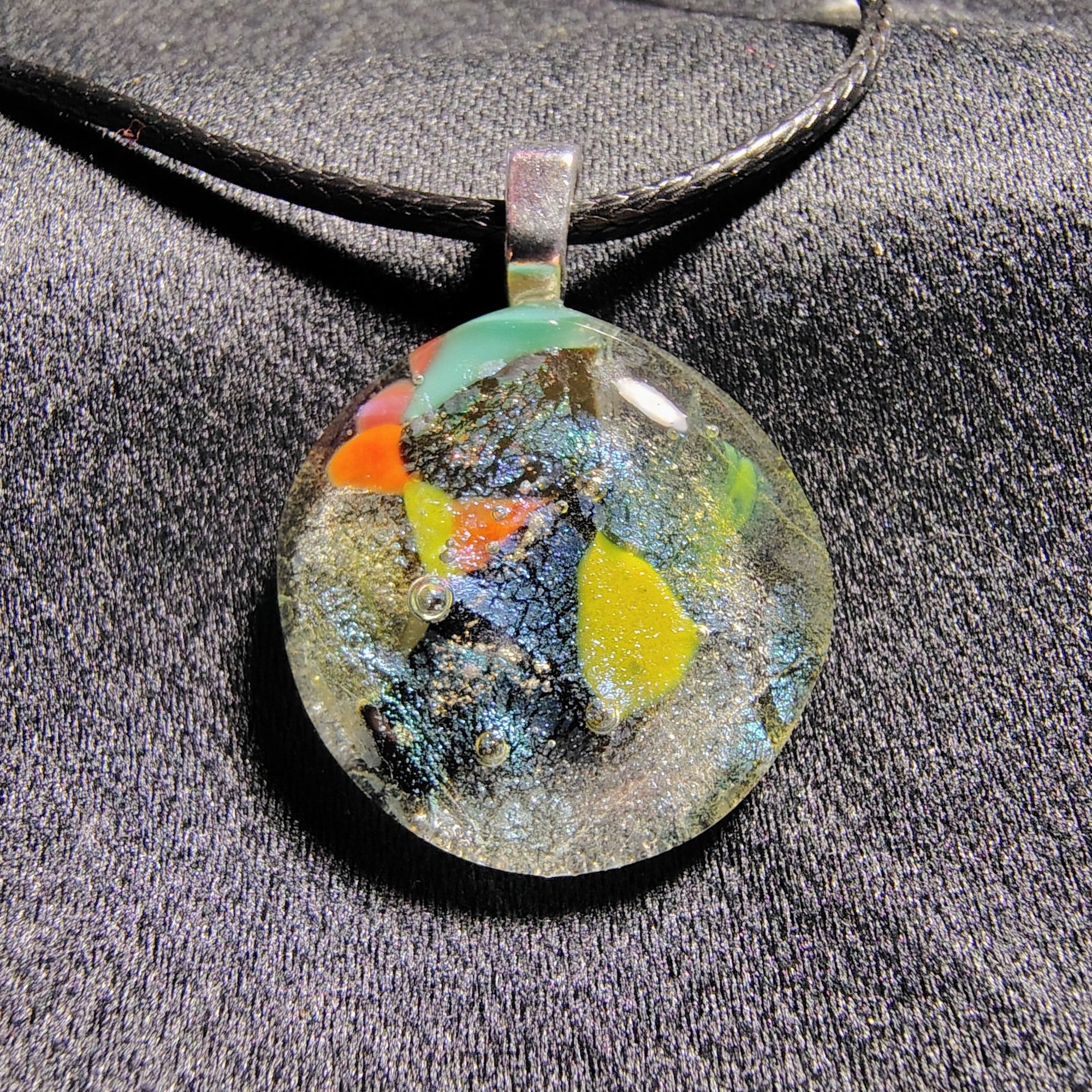fused dichroic glass, silver plated bail, 20" woven lobster clasp cord